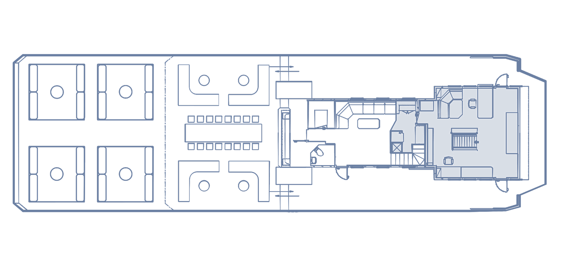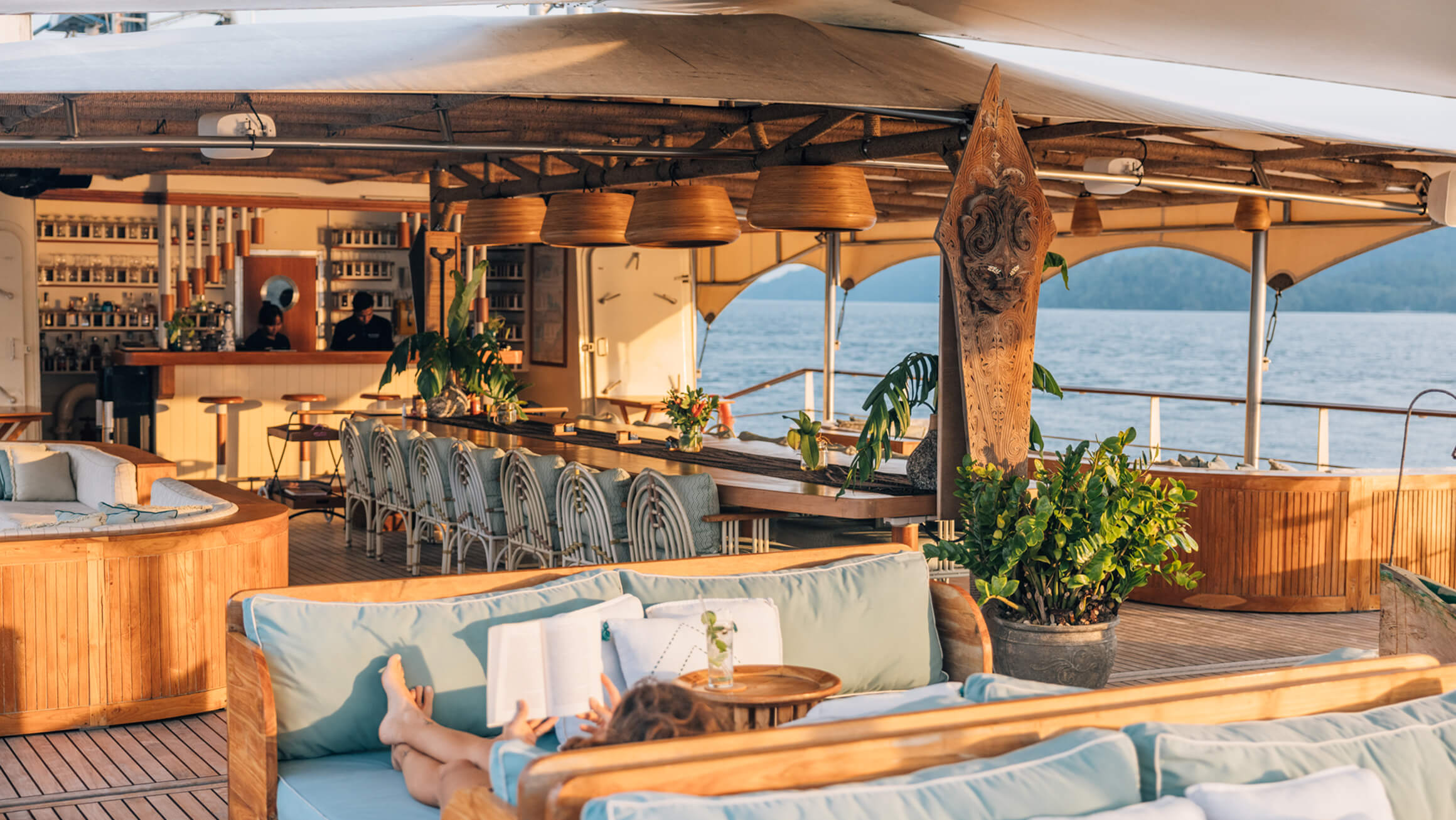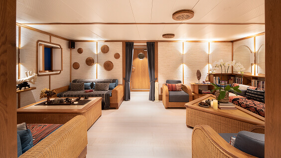 With a dining area, bar, and lounging areas with sofas and daybeds, this is the place to hang out and share stories of the day’s adventures, play a game, or find a quiet corner to grab a nap or read a book.