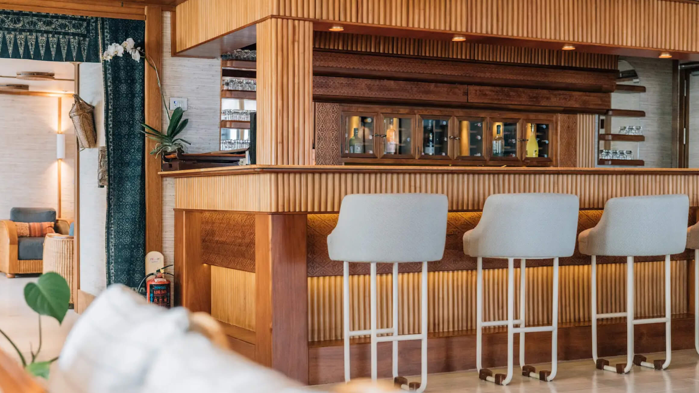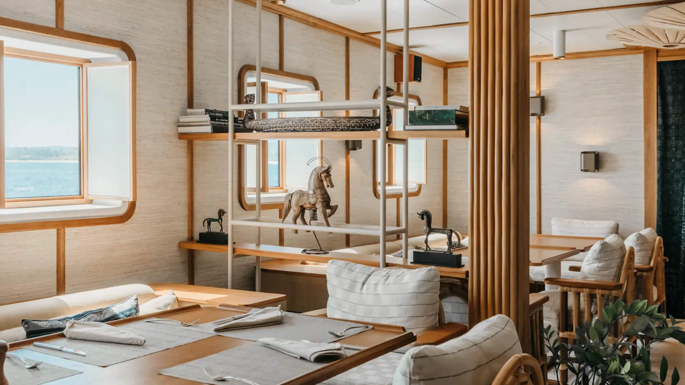 As you board, subtle nods to classic steamships catch your eye — woven ceiling panels, polished teak, stainless steel portholes, bamboo lights, and rope-wrapped supports. Beneath her steel frame, this old girl reveals a softer, more inviting side.